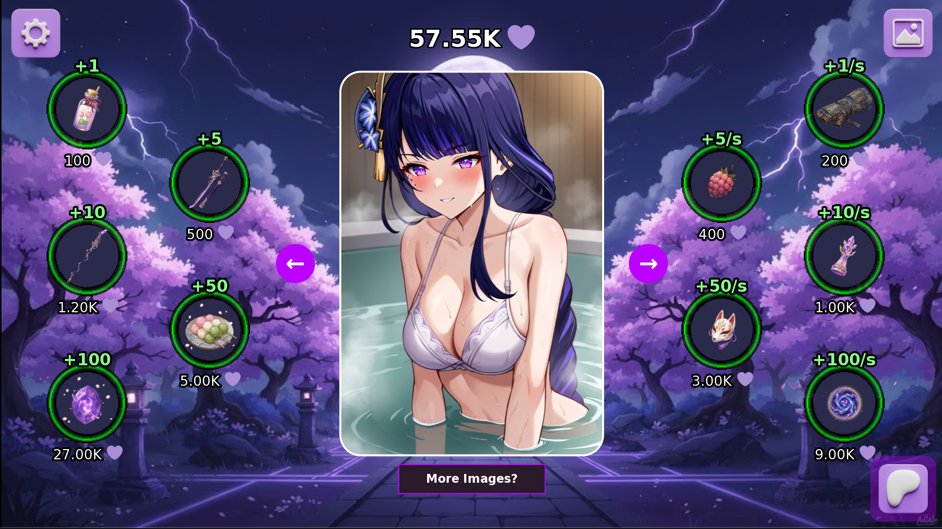 Face the Almighty Narukami Ogosho in her most vulnerable state yet. In this standalone clicker experience, your goal is simple: Generate enough energy to impress the Shogun and peel away her layers of authority—literally.